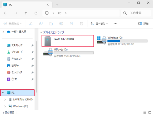 通知が表示されない、または消えてしまった場合は、エクスプローラーを起動して、画面左側から「PC」をクリックし、タブレット名のアイコンをダブルクリックして手順7へ進みます。