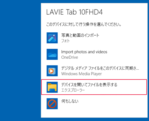 デバイスに対して行う操作を選択する画面が表示されたら、「デバイスを開いてファイルを表示する」をクリックします。