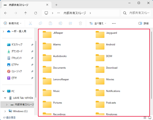 「1. パソコンにタブレットのフォルダーを表示する方法」の手順8で表示したタブレットのフォルダーを開き、バックアップしたいフォルダーやデータを表示します。