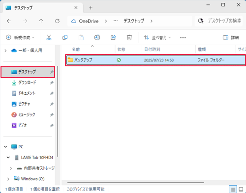 ここでは例として、エクスプローラーを起動し、「デスクトップ」に「バックアップ」フォルダーを作成します。