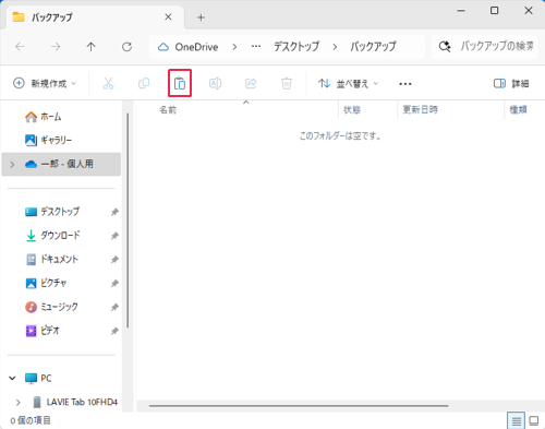 バックアップデータを保存するパソコンのフォルダーを開き、コマンドバーから「」(貼り付け)をクリックします。