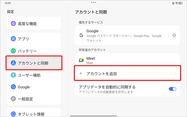 画面左側から「アカウントと同期」をタップし、表示された一覧から「アカウントを追加」をタップします。