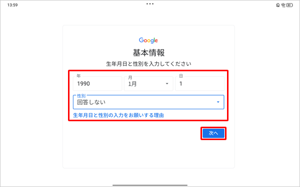 生年月日と性別をそれぞれのボックスに入力して、「次へ」をタップします。
