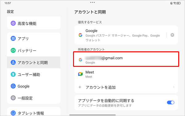 「アカウントと同期」画面に戻ったら、登録したGoogleアカウントが表示されていることを確認します。
