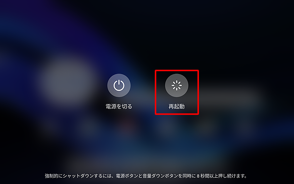電源ボタンを長押しし、表示された画面から「再起動」をタップします。
