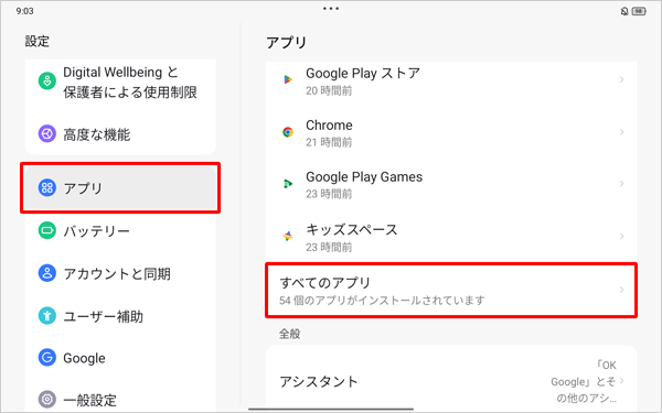 画面左側から「アプリ」をタップし、表示された一覧から「すべてのアプリ」をタップします。