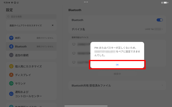 ペア設定が失敗した場合は、以下のようなメッセージが表示されます。