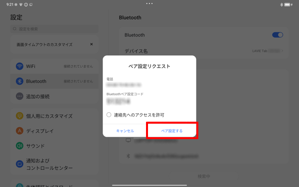 接続先のBluetooth機器にペア設定画面が表示された場合は、PINなど内容が合っているか確認して設定を行います。