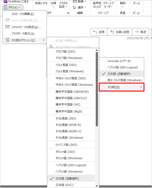 日本語のメールの場合は、以下のいずれかの項目をクリックして、文字化けが改善するか確認します。