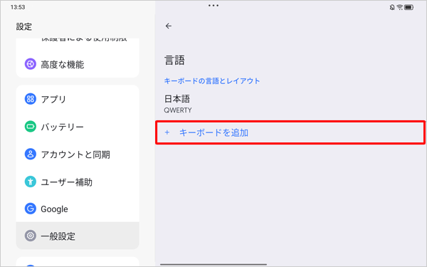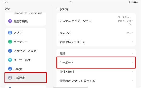 画面左側から「一般設定」をタップし、表示された一覧から「キーボード」をタップします。