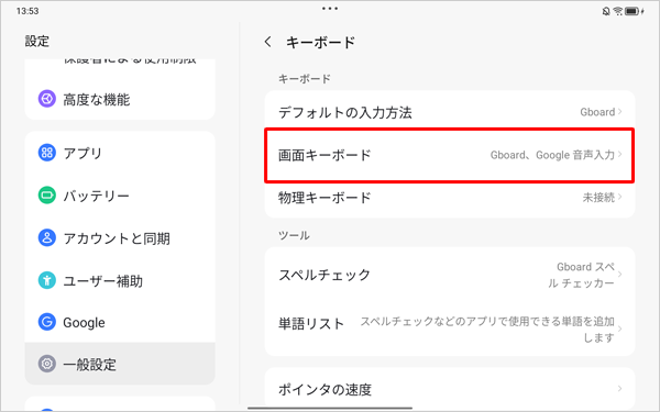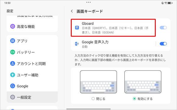 タブレットではさまざまな画面キーボードを使用できますが、ここでは「Gboard」という画面キーボードを使用して、文字入力に使用する言語を設定する方法を案内します。