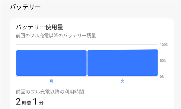 また、設定の「バッテリー」画面では、バッテリーの使用状況の履歴や詳細を確認することができます。
