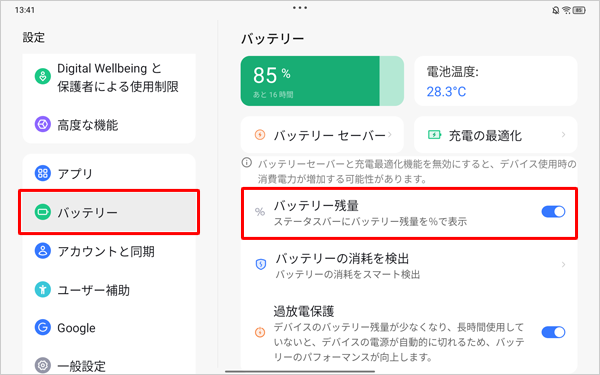 画面左側から「バッテリー」をタップし、「バッテリー残量」をタップして、スイッチを「オン」にします。