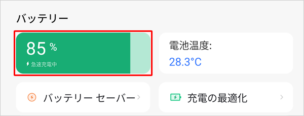 設定の「バッテリー」画面から確認するには、以下の操作手順を行ってください。