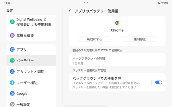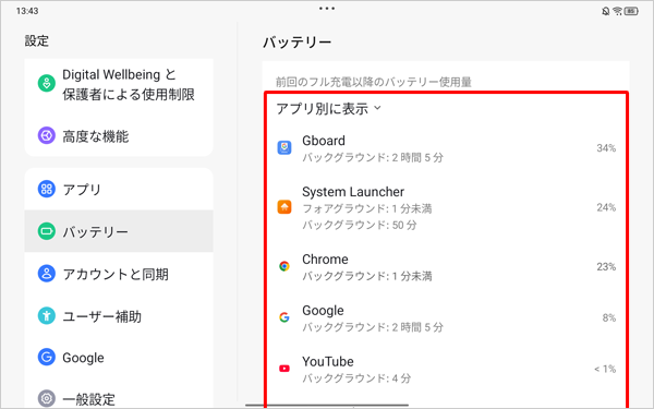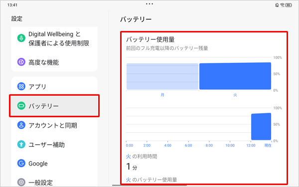 タブレットの電力消費が激しい場合には、「バッテリー使用量」欄で「バッテリー残量」を確認できます。
