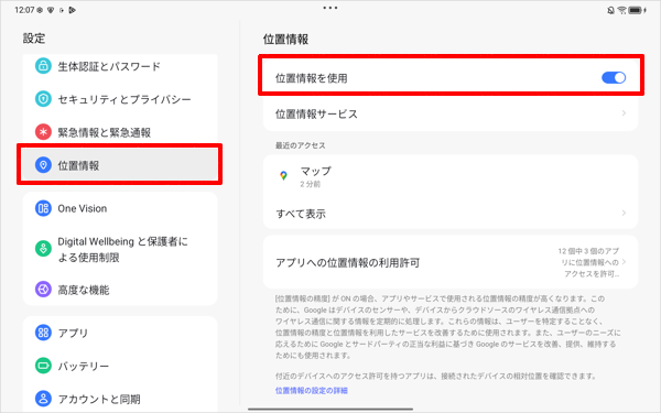 画面左側から「位置情報」をタップし、表示された一覧から「位置情報を使用」が「ON」に設定されていることを確認し、「OFF」になっている場合は、タップして「ON」に設定します。