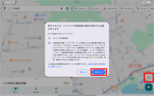 「位置情報の精度を改善」が「OFF」に設定されていると、画面右下の「」をタップした際に「続行するには、デバイスで位置情報の精度を使用する必要があります」というメッセージが表示されます。この場合、「ONにする」をタップします。