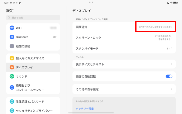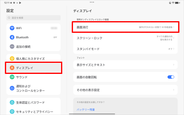 画面左側から「ディスプレイ」をタップし、表示された一覧から「画面消灯」をタップします。