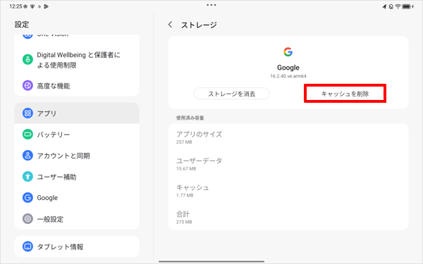 Googleアプリのキャッシュデータを削除することによって、メモリの空き容量が増加します。