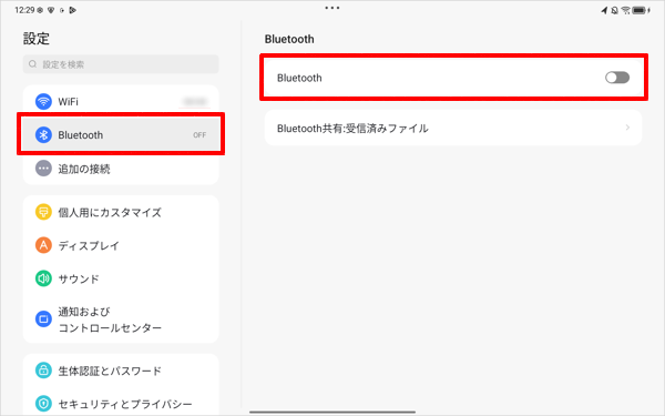 画面左側から「Bluetooth」をタップし、表示されたメニューの「Bluetooth」が「オン」になっている場合は、右端のつまみをタップして「オフ」にします。