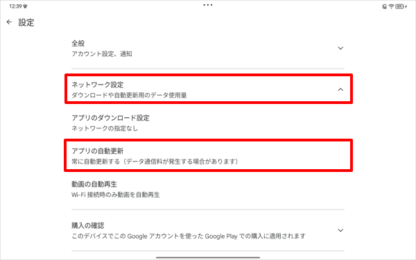 表示された一覧から「ネットワーク設定」をタップし、「アプリの自動更新」をタップします。