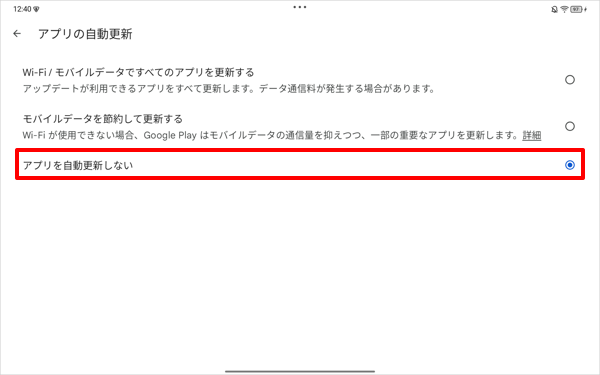 自動更新の設定を解除し、すべてのアプリを手動で更新したい場合は、手順6で「アプリを自動更新しない」をタップしてください。