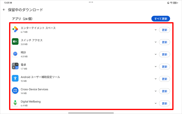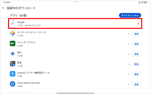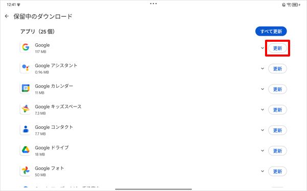 「保留中のダウンロード」が表示されたら、一覧から更新したいアプリの「更新」をタップします。