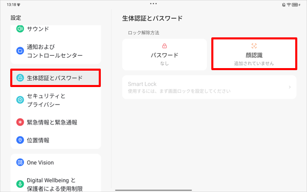 画面左側から「生体認証とパスワード」をタップし、表示された一覧から「顔認識」をタップします。