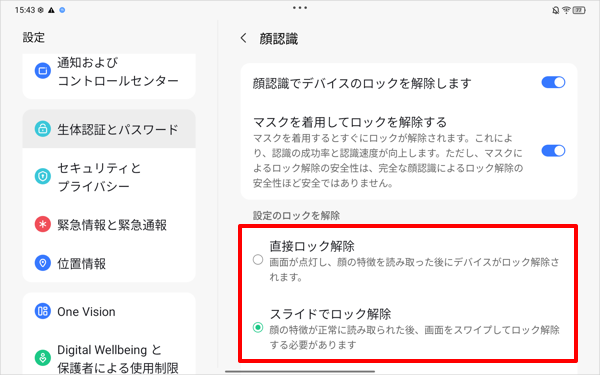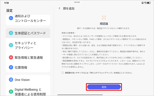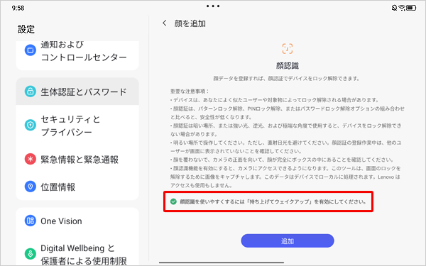 「顔認識を使いやすくするには…」にチェックを入れると、タブレットを持ち上げたときに顔認証が自動で起動するように設定することができます。