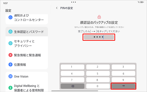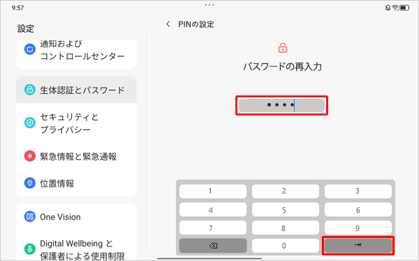 4桁以上の数字をPINとして設定し、「」をタップします。