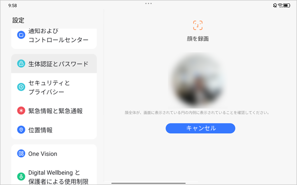 LAVIE Tab T10(2025年04月発表機種)の顔認証搭載機種で画面ロックを設定するには、以下の操作手順を行ってください。