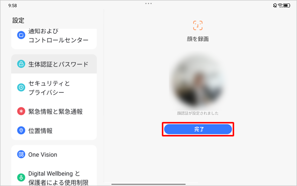 顔認証の登録が完了すると、「顔認証が設定されました」と表示されます。