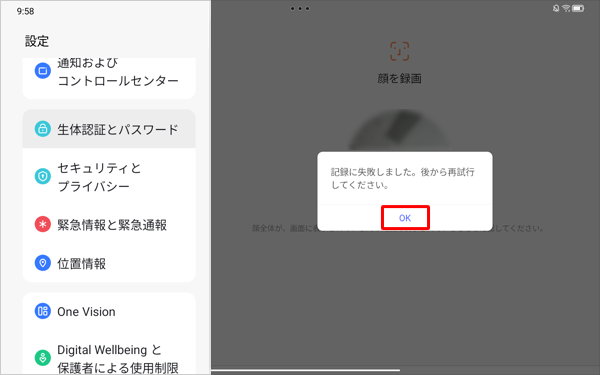 顔認証の登録に失敗すると、「記録に失敗しました。…」と表示されます。