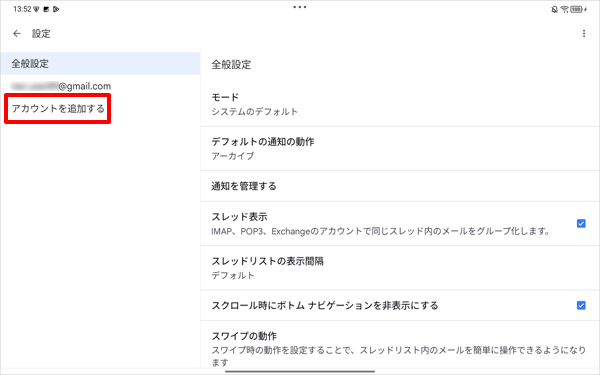 「設定」が表示されたら、画面左側から「アカウントを追加する」をタップし、画面の案内に沿って操作を行います。
