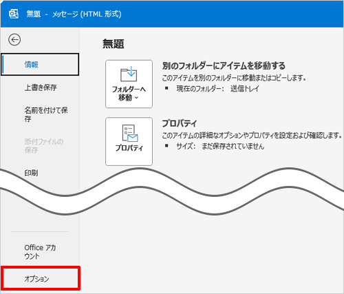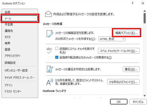 画面左側から「メール」をクリックし、「メッセージの作成」欄の「編集オプション」をクリックします。