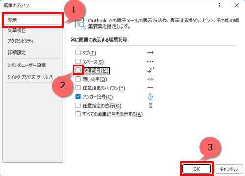段落記号を表示させたくない場合は、「Outlookのオプション」の表示設定を変更し、非表示にすることができます。