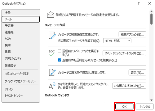 「Outlookのオプション」画面に戻ったら、「OK」をクリックします。