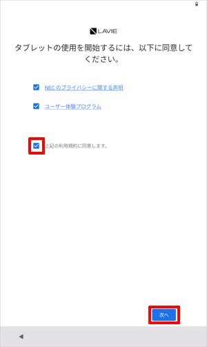 「上記の利用規約に同意します。」の前にあるチェックボックスにチェックを入れて、「次へ」をタップします。
