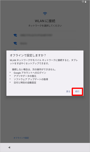 「オフラインで設定しますか?」が表示されたら、「続行」をタップします。