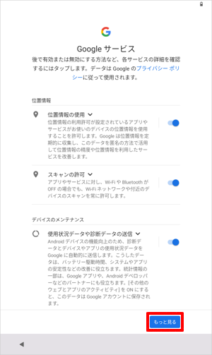 初期設定後にワイヤレスネットワーク(無線LAN)の接続やGoogleアカウントの登録を行う場合は、以下の情報を参照してください。