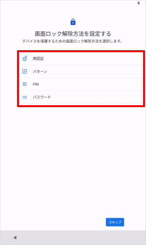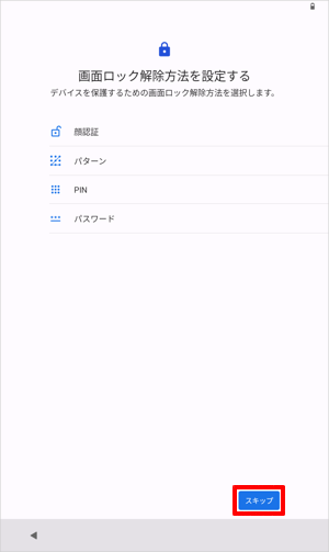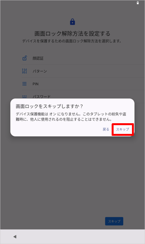 「画面ロックをスキップしますか?」が表示されたら、「スキップ」をタップします。