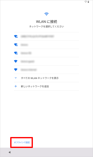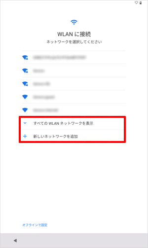 周囲のワイヤレスネットワークが自動で検出されるので、接続したいネットワークをタップするか、「オフラインで設定」をタップします。