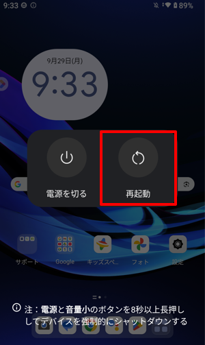 1. 電源ボタンを長押しし、表示された画面から「再起動」をタップします。