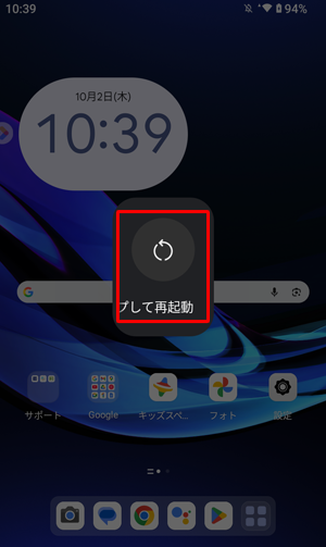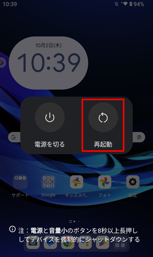 1. 電源ボタンを長押しし、画面中央に表示された一覧から「再起動」をタップします。