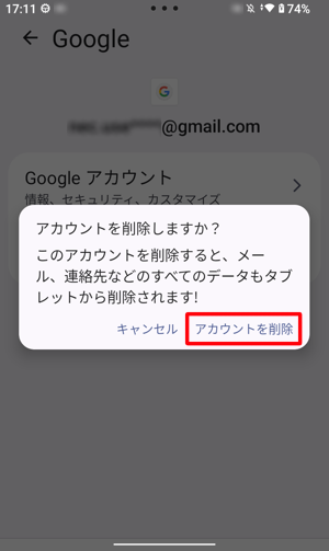 Gmailやカレンダー、連絡先など、アカウントに関するデータがすべて削除されます。