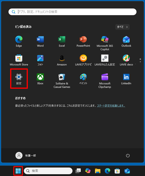 「スタート」をクリックし、表示されたメニューから「設定」をクリックします。