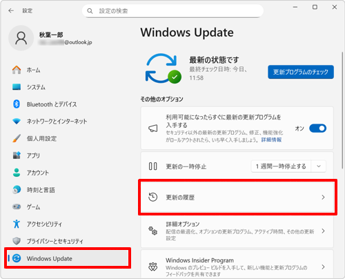 画面左側から「Windows Update」をクリックし、表示された一覧から「更新の履歴」をクリックします。