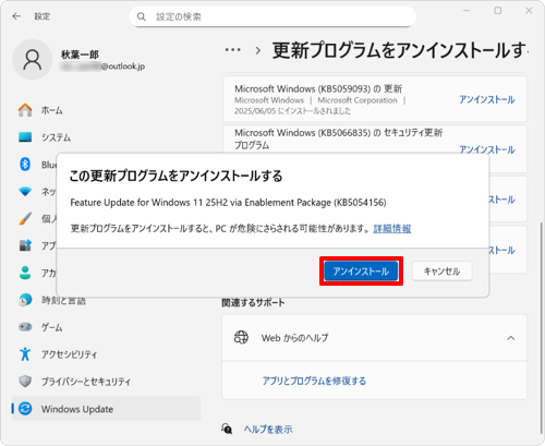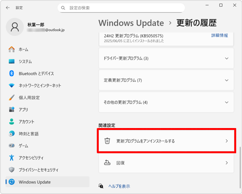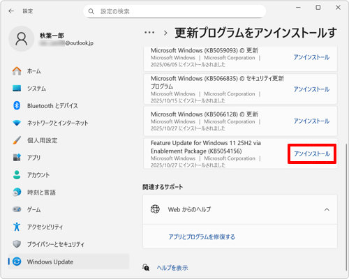 更新プログラムをアンインストールして以前のバージョンのWindows 11 2024 Update(バージョン24H2)に戻すには、以下の操作手順を行ってください。