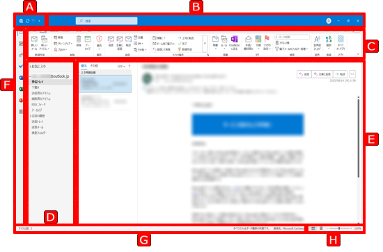 | E | 情報表示ウィンドウ | メールや予定表、連絡先、タスクなどの情報が表示されます。 また、画面右側のアイコンでメールの返信や削除、移動などの作業ができます。 |
