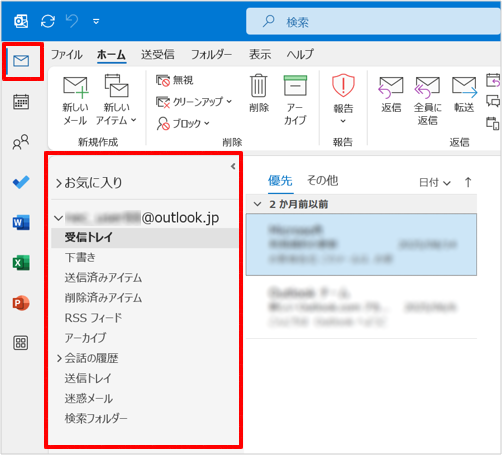 メールを使用する際に、ナビゲーションバーの「メール」をクリックすると、メールの「フォルダーウィンドウ」が表示されます。